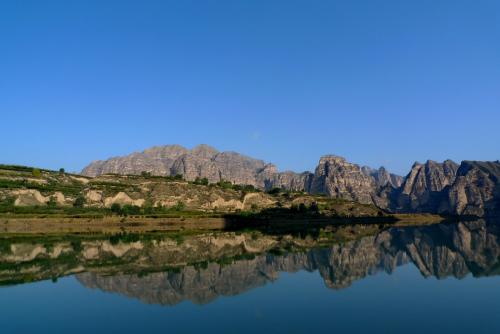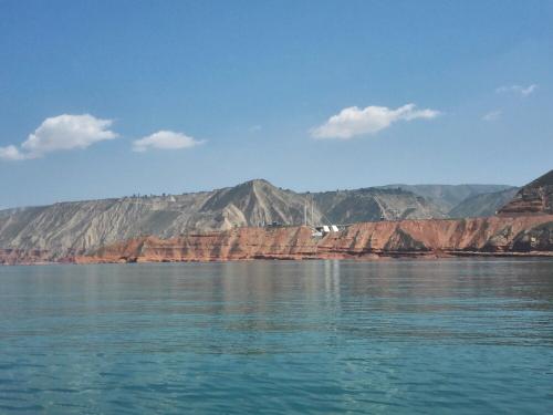 劉家峽位于蘭州的上游不遠處,在黃土山的懷抱下的 一汪碧水,這是一池需要機動船跑兩個多小時才到頭的水。 在庫水的盡頭,便是洮河與黃河主干流的交匯處,遠遠望去,有一道藍色與金色的分界線,因為兩股水流來源 不同,洮河來自甘南青山中間,而主干流已在黃土高原行 走了一段,如果你回頭,將視線抬起,你會看到同樣的兩 道分界線:碧水與黃土山,黃土山與青天。這種感覺也許只有劉家峽才有。