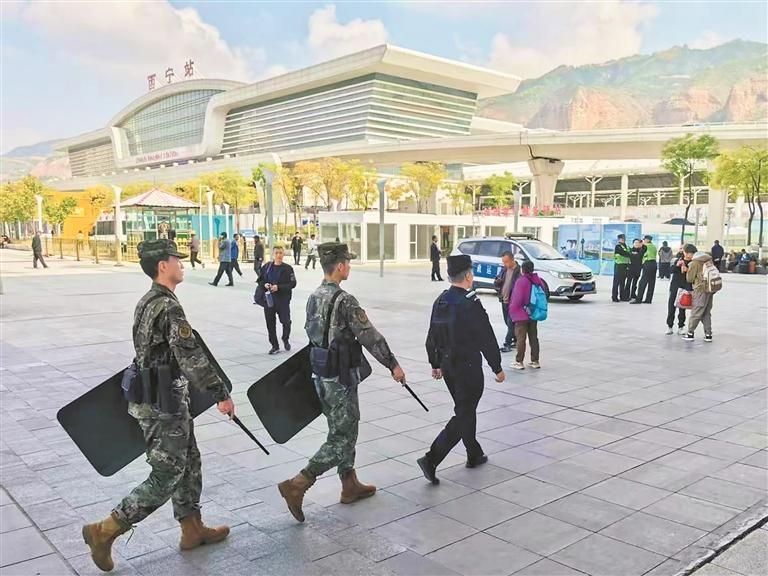 巡邏人員在西寧站前廣場(chǎng)執(zhí)行安保任務(wù)。火車站街道供圖