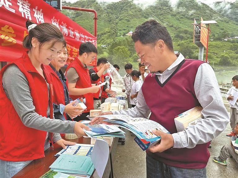 圖為林芝市墨脫縣格當鄉(xiāng)黨委、政府工作人員向群眾發(fā)放宣傳品。記者 王敏 攝