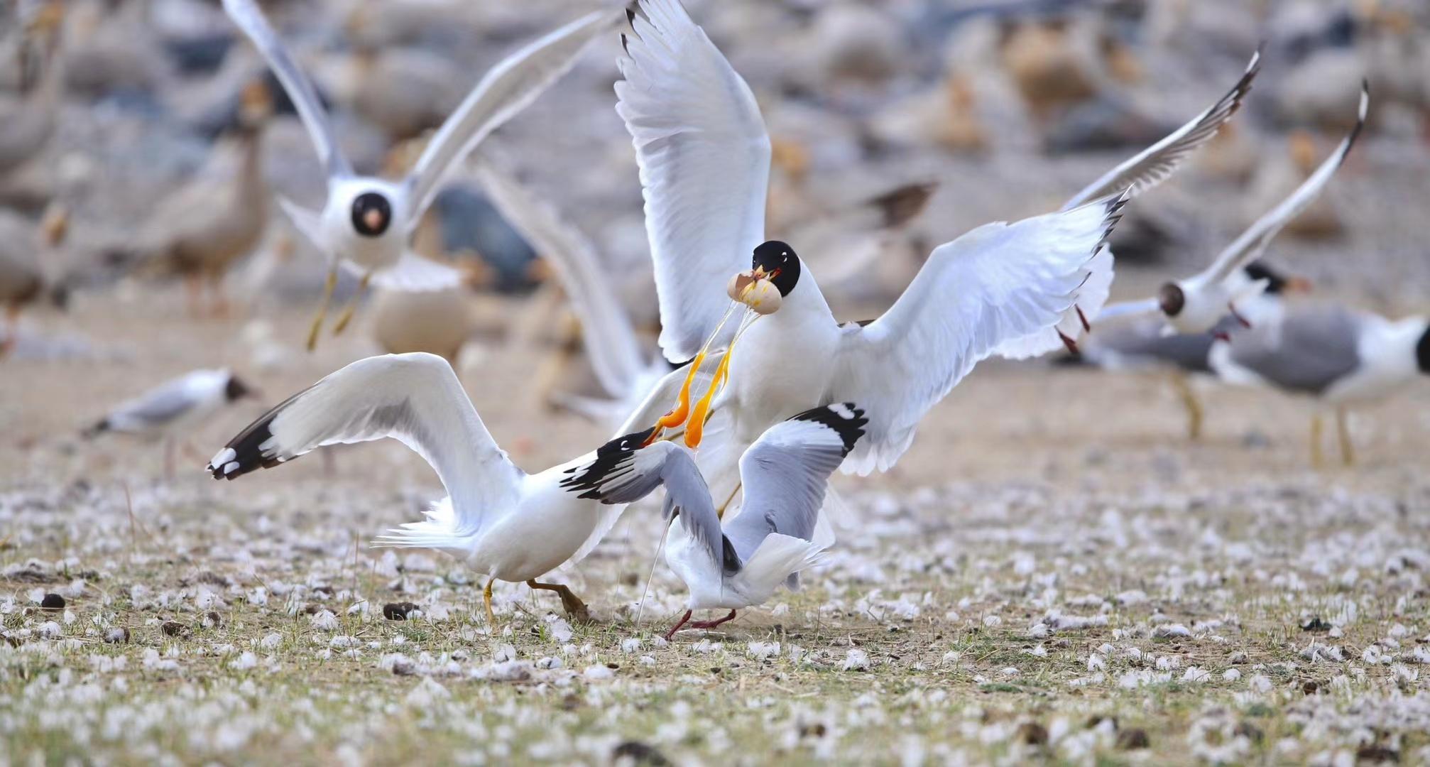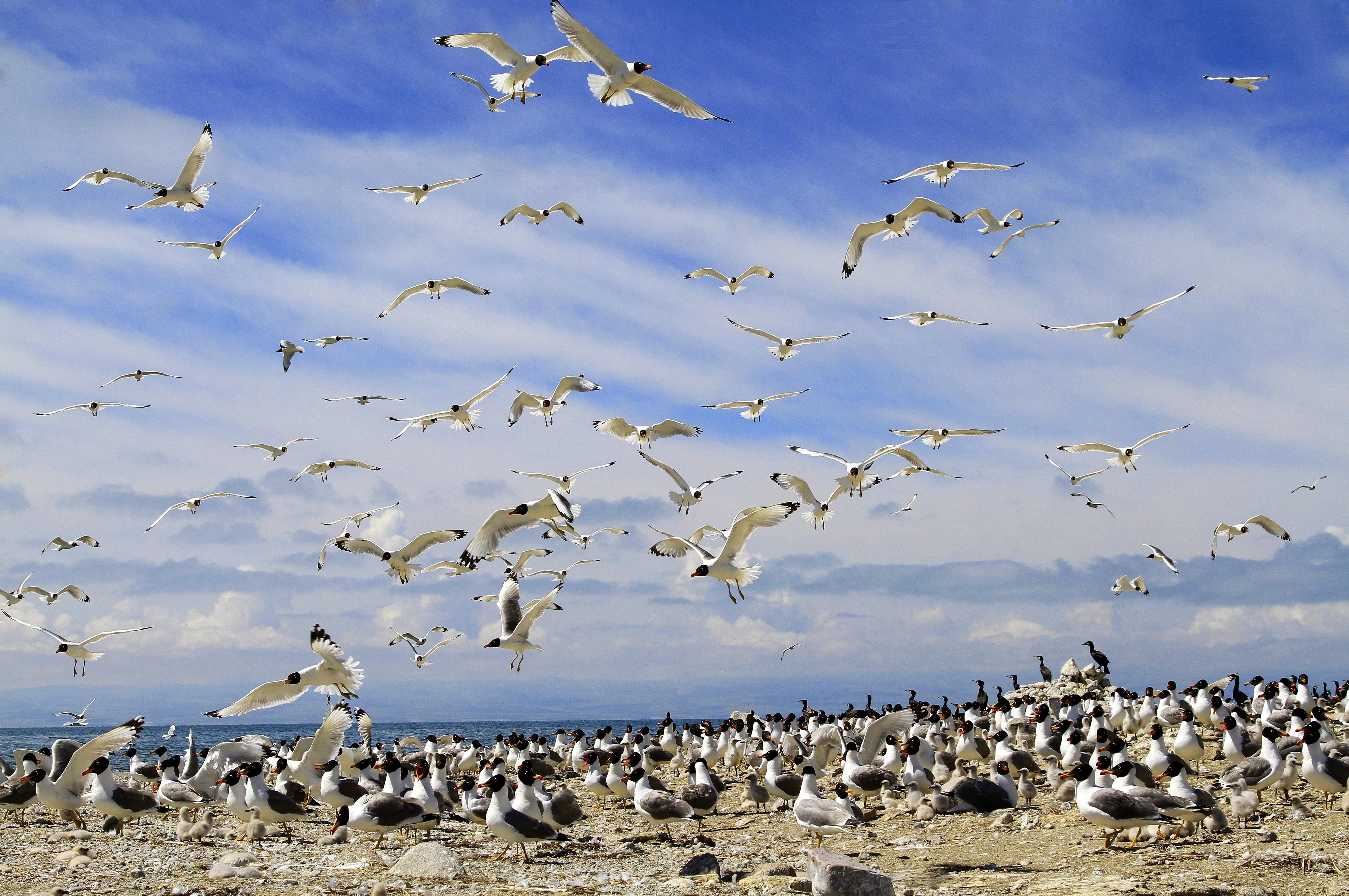 候鳥北歸,青海湖又將進入一年中最美麗的時節(jié)。浮想盛夏時節(jié),棕頭鷗、漁鷗、斑頭雁、普通鸕鶿等水鳥,或成群在低空中擺著“隊形”,或“拖家?guī)Э凇痹谒嫔湘覒蛲嫠#蚝弯в蔚匿音~上演魚鷗“大戰(zhàn)”,碧波蕩漾的青海湖將美得如詩如畫。