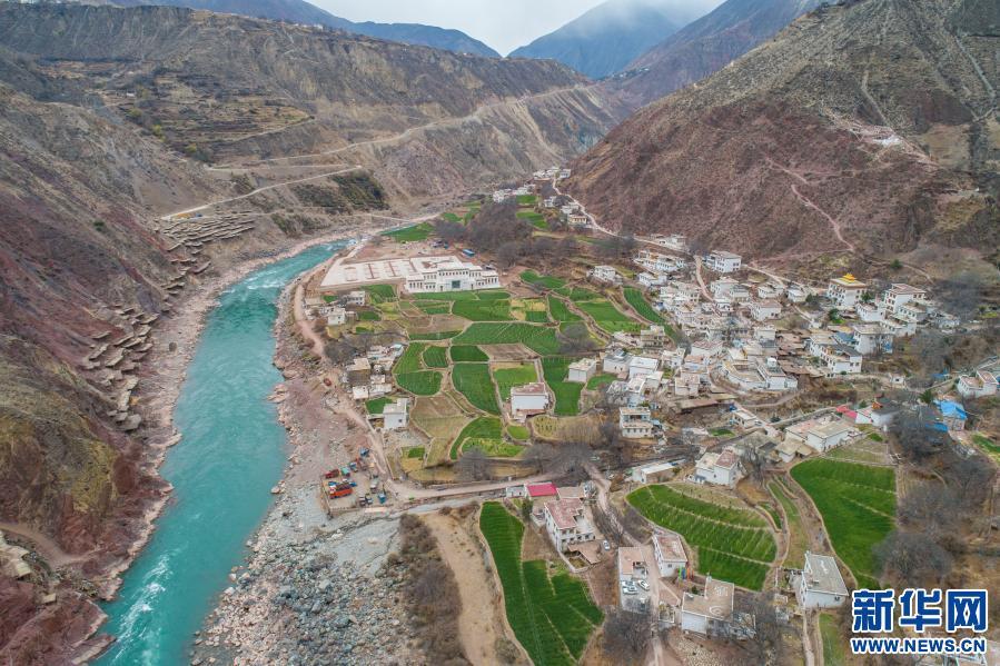 在西藏昌都市芒康縣納西民族鄉(xiāng)拍攝的鹽田附近的村落(2月18日攝,無人機(jī)照片)。新華社記者 孫非 攝