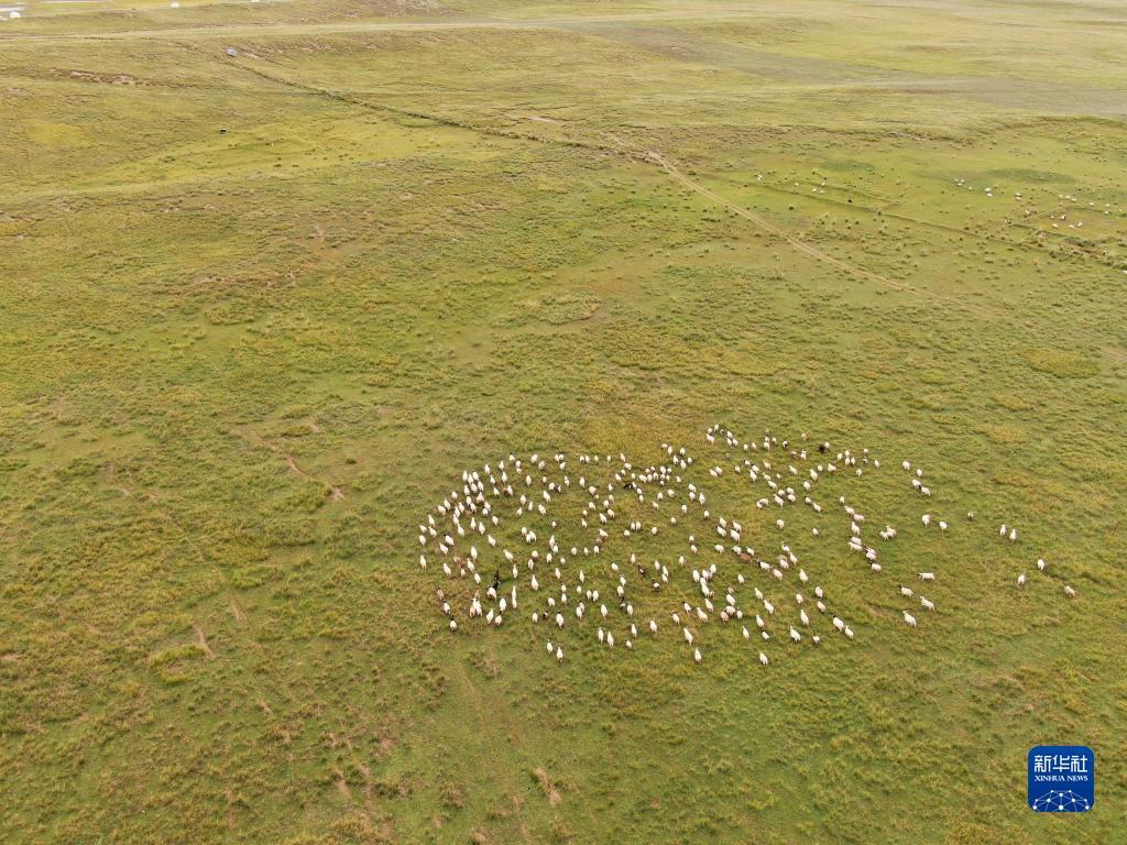 9月15日,一群羊在青海湖岸邊的牧場(chǎng)上覓食(無人機(jī)照片)。?新華社記者 張龍 攝