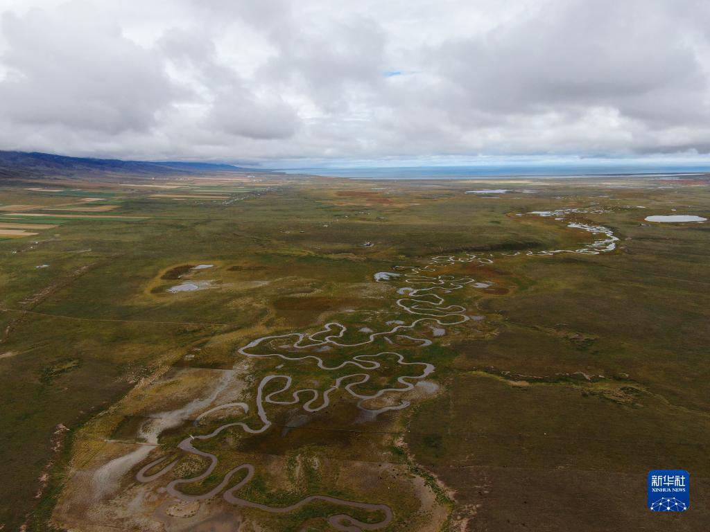這是9月15日拍攝的青海湖畔的倒淌河(無人機(jī)照片)。?新華社記者 張龍 攝