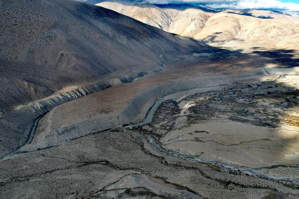 離開參木達(dá)村,沿扎嘎曲逆流而上行駛約20分鐘后,公路旁的扎嘎曲開始在峽谷中東西向蜿蜒而行,進(jìn)入整條河流的最狹窄處。記者在S516省道29公里處停車航拍,只見公路與河流像兩條平行的曲線,時(shí)遠(yuǎn)時(shí)近,向遠(yuǎn)方延伸。