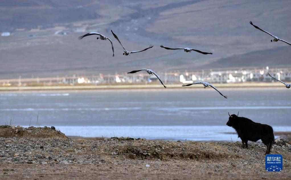 黑頸鶴在拉薩市林周縣飛翔(1月8日攝)。新華社記者 黃豁 攝