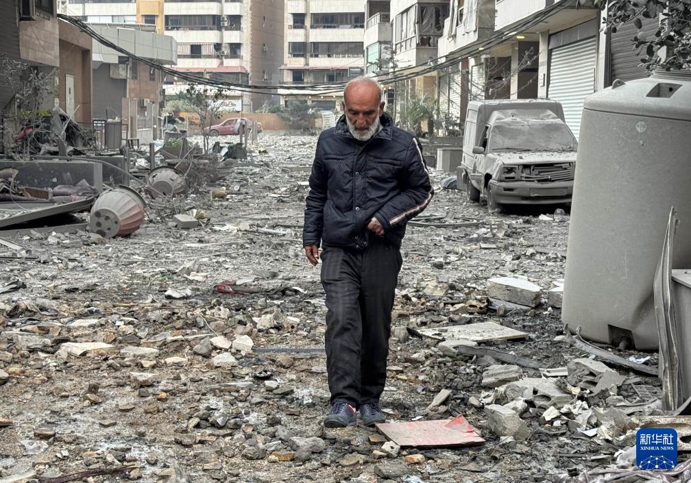 3月7日,在黎巴嫩首都貝魯特南郊,一名男子行走在以色列襲擊后的街道上。新華社發(fā)(比拉爾·賈維希攝)