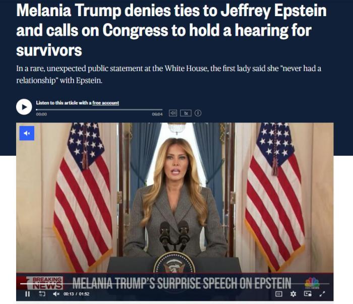 梅拉尼婭說(shuō),她此舉部分是為了回應(yīng)社交媒體上流傳的將她與愛(ài)潑斯坦聯(lián)系起來(lái)的虛假圖像和言論。她說(shuō):“這些圖像和說(shuō)法完全是假的。”