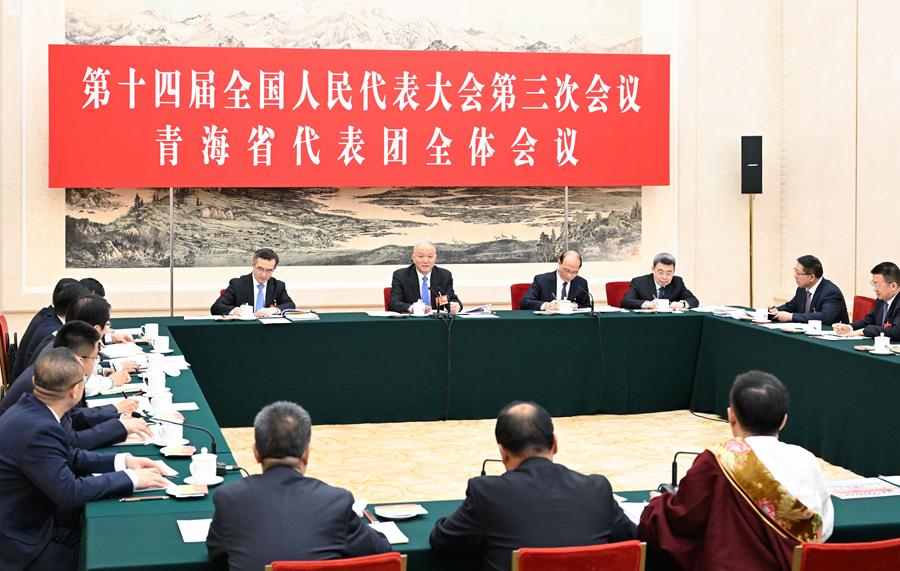 3月7日上午,中共中央政治局常委、中央書(shū)記處書(shū)記蔡奇來(lái)到他所在的青海代表團(tuán),同代表們一起審議。新華社記者 申宏 攝