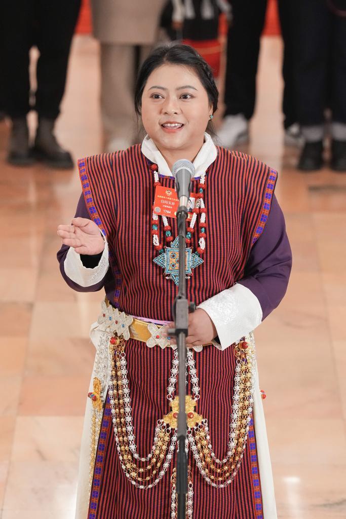 3月10日,全國政協(xié)十四屆三次會議第三場“委員通道”集體采訪活動在北京人民大會堂舉行。這是全國政協(xié)委員白瑪玉珍接受媒體采訪。新華社記者 才揚 攝