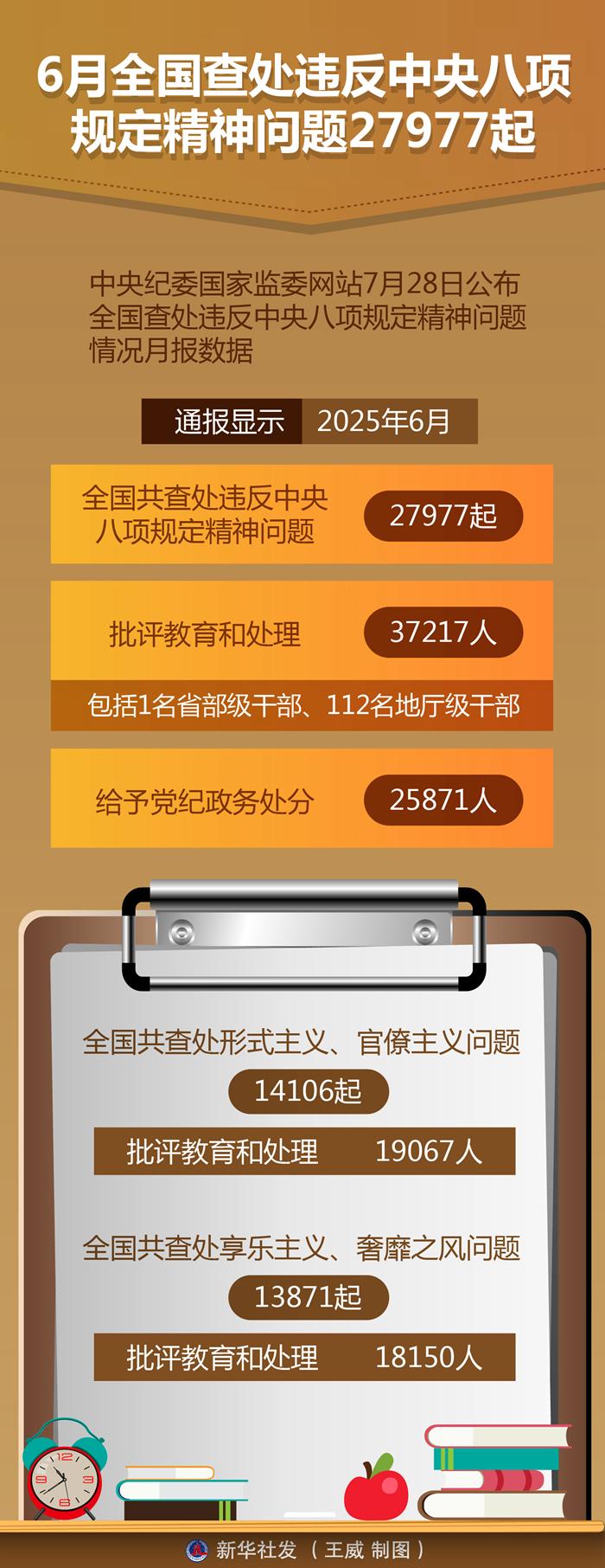 新華社北京7月28日電 中央紀(jì)委國(guó)家監(jiān)委網(wǎng)站28日公布全國(guó)查處違反中央八項(xiàng)規(guī)定精神問(wèn)題情況月報(bào)數(shù)據(jù)。通報(bào)顯示,今年6月,全國(guó)共查處違反中央八項(xiàng)規(guī)定精神問(wèn)題27977起,批評(píng)教育和處理37217人(包括1名省部級(jí)干部、112名地廳級(jí)干部),給予黨紀(jì)政務(wù)處分25871人。