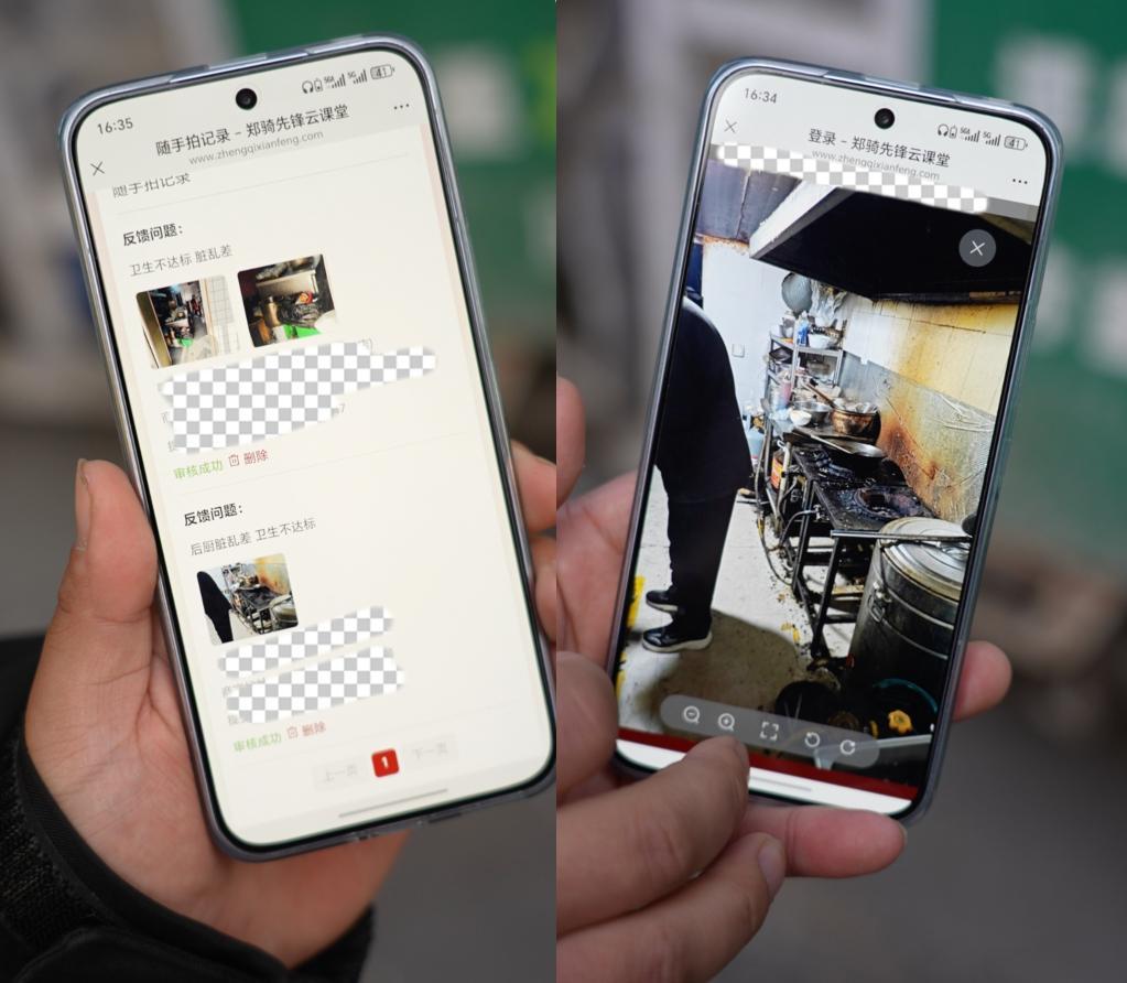 圖為騎手展示的“鄭騎先鋒隨手拍”手機(jī)操作頁(yè)面(拼版照片)。新華社記者 孫清清 攝