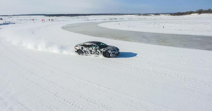 冰面上,十余臺作業(yè)車輛正緊鑼密鼓地維護(hù)專用冰道。隨后,一輛輛測試車相繼駛?cè)?在冰層上疾馳、急剎、甩尾轉(zhuǎn)向,場面蔚為壯觀。