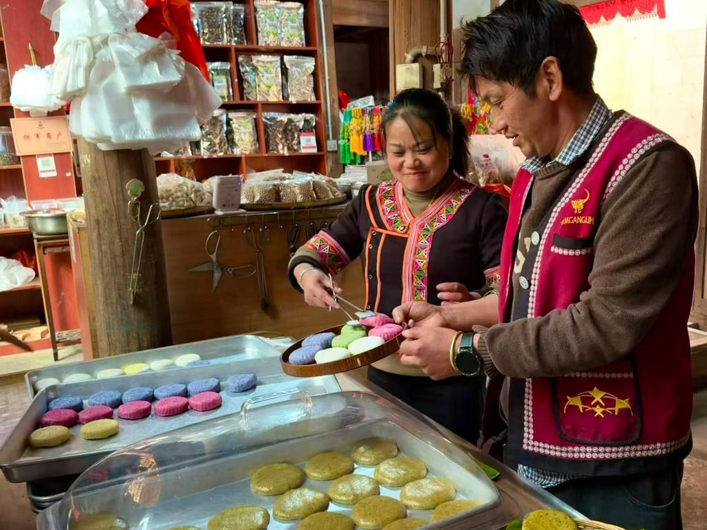 2026年1月27日,云南省騰沖市清水鎮(zhèn)司莫拉佤族村村民李發(fā)順?lè)驄D正在為游客打包大米粑粑。新華社記者 熊軒昂 攝