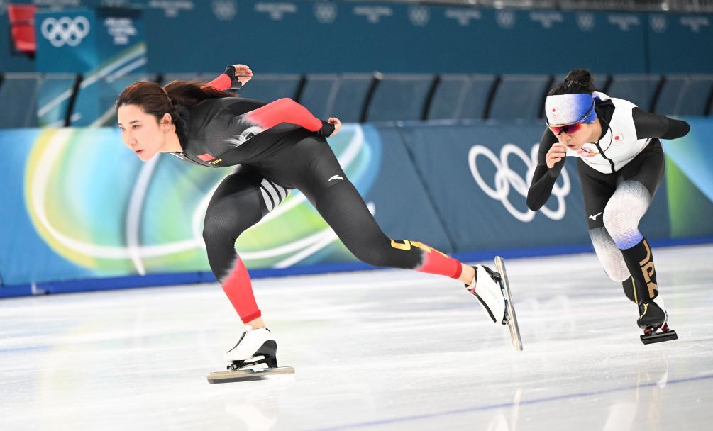 2月5日,中國運(yùn)動員韓梅(左)和日本運(yùn)動員高木美帆在訓(xùn)練中。新華社記者 武巍 攝