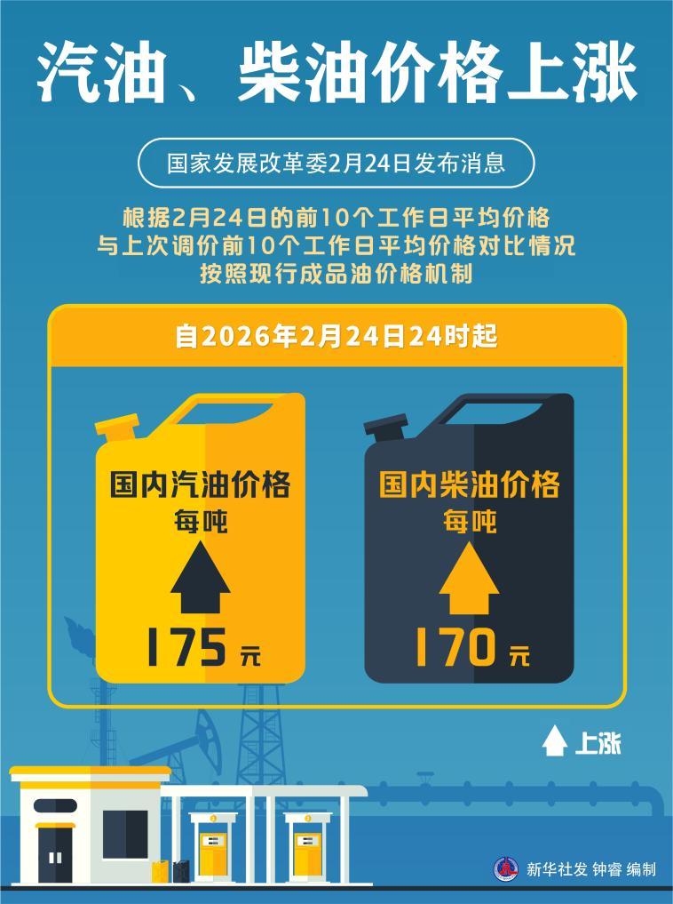 新華社北京2月24日電 國家發(fā)展改革委24日發(fā)布消息,近期國際市場油價波動上升,根據2月24日的前10個工作日平均價格與上次調價前10個工作日平均價格對比情況,按照現(xiàn)行成品油價格機制,自2月24日24時起,國內汽、柴油價格每噸分別上漲175元和170元。