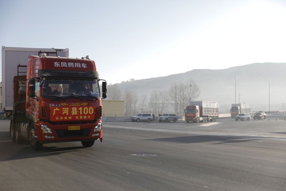 2023年12月26日,在甘肅省臨夏州積石山高速出口,載著活動板房的貨車駛向受災鄉(xiāng)鎮(zhèn)。新華社記者 方欣 攝