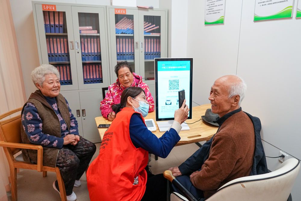 2025年10月23日,老人在山東省淄博市張店區(qū)馬尚街道金石社區(qū)日間護(hù)理中心測(cè)量健康數(shù)據(jù)。新華社記者 朱崢 攝