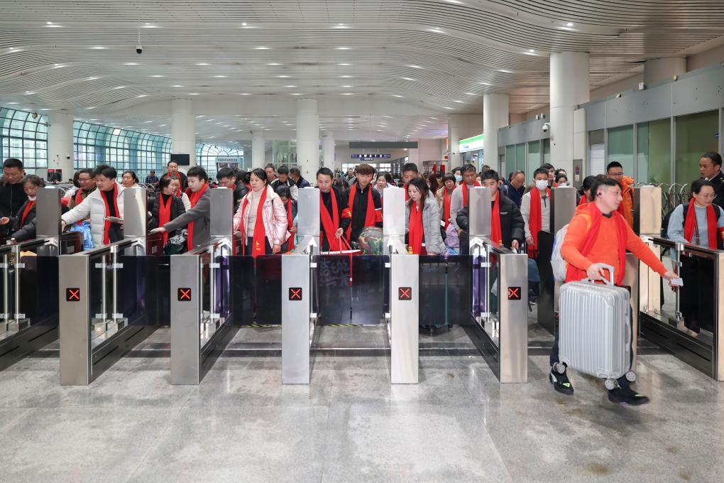 2月11日,棗陽籍務工團體在上海站優(yōu)先檢票進站。新華社記者 王翔 攝
