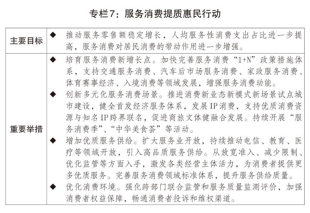 清理消費(fèi)領(lǐng)域不合理限制措施。分年限保障“久搖不中”無(wú)車家庭購(gòu)車需求,完善郵輪游艇、汽車改裝、房車露營(yíng)、航空飛行營(yíng)地等行業(yè)標(biāo)準(zhǔn)和管理機(jī)制,簡(jiǎn)化賽事等大型活動(dòng)審批,豐富戶外運(yùn)動(dòng)項(xiàng)目和賽事活動(dòng)供給,鼓勵(lì)熱門旅游景區(qū)、有條件的文博體場(chǎng)館延長(zhǎng)開放時(shí)間,釋放文旅、賽事、康養(yǎng)等領(lǐng)域消費(fèi)潛力。支持有條件的地方推廣中小學(xué)春秋假,落實(shí)職工帶薪錯(cuò)峰休假制度。實(shí)施充電設(shè)施“三年倍增”行動(dòng),加快充電樁、停車場(chǎng)、旅游公路等消費(fèi)基礎(chǔ)設(shè)施建設(shè)。完善農(nóng)村物流配送網(wǎng)絡(luò),推動(dòng)優(yōu)質(zhì)消費(fèi)品進(jìn)入農(nóng)村市場(chǎng)。深入推進(jìn)國(guó)際消費(fèi)中心城市建設(shè),開展國(guó)際化消費(fèi)環(huán)境建設(shè)試點(diǎn),提升入境消費(fèi)便利化國(guó)際化水平,大力發(fā)展入境旅游,打造“購(gòu)在中國(guó)”品牌。推動(dòng)一刻鐘便民生活圈擴(kuò)圍升級(jí),優(yōu)化社區(qū)消費(fèi)條件。加大消費(fèi)者權(quán)益保護(hù)力度,加強(qiáng)直播帶貨等領(lǐng)域監(jiān)管。