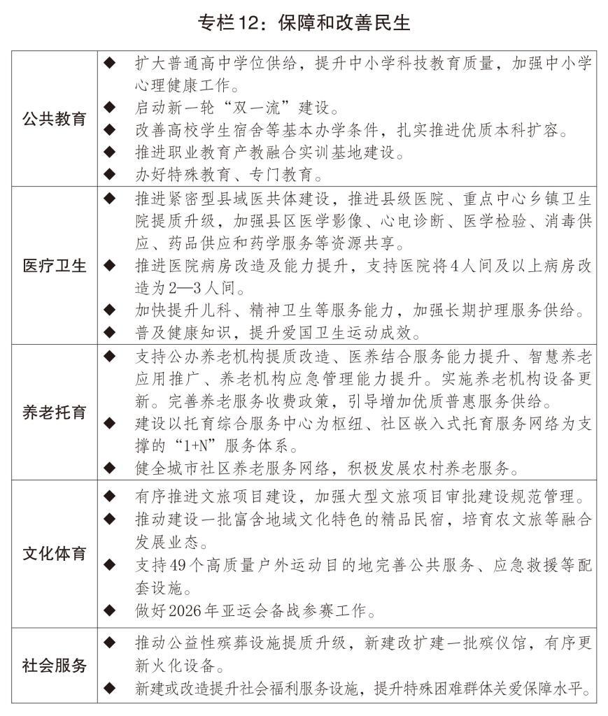 二是構(gòu)建優(yōu)質(zhì)均衡公共服務(wù)體系。穩(wěn)步推進(jìn)基本公共服務(wù)均等化。適應(yīng)學(xué)齡人口變化,優(yōu)化學(xué)前和義務(wù)教育資源配置,增加普通高中學(xué)位供給和優(yōu)質(zhì)高校本科招生。全面推進(jìn)健康學(xué)校建設(shè)。深化實(shí)施醫(yī)療衛(wèi)生強(qiáng)基工程,完善國(guó)家區(qū)域醫(yī)療中心管理體制和運(yùn)行機(jī)制,促進(jìn)優(yōu)質(zhì)醫(yī)療資源擴(kuò)容下沉和區(qū)域均衡布局,加強(qiáng)縣區(qū)、基層醫(yī)療機(jī)構(gòu)運(yùn)行保障。支持心理健康和精神衛(wèi)生、婦女兒童健康服務(wù)體系建設(shè),實(shí)施康復(fù)護(hù)理擴(kuò)容提升工程。健全公共衛(wèi)生防控救治體系。加強(qiáng)慢性病、罕見病防治,全方位提升急診急救、血液保障和應(yīng)急能力。推進(jìn)中醫(yī)藥傳承創(chuàng)新,促進(jìn)中西醫(yī)結(jié)合。推出促進(jìn)銀發(fā)經(jīng)濟(jì)高質(zhì)量發(fā)展的增量政策,培育發(fā)展銀發(fā)經(jīng)濟(jì)龍頭企業(yè),推進(jìn)老年人力資源開發(fā),更好滿足老年人多元化需求。發(fā)展醫(yī)養(yǎng)結(jié)合服務(wù),推行長(zhǎng)期護(hù)理保險(xiǎn),健全失能失智老年人照護(hù)體系。實(shí)施早孕關(guān)愛行動(dòng)、孕育和出生缺陷防治能力提升計(jì)劃。發(fā)揮育兒補(bǔ)貼作用,完善生育保險(xiǎn)、生育休假等制度。推進(jìn)普惠養(yǎng)老托育服務(wù)體系建設(shè),提升社區(qū)養(yǎng)老托育等服務(wù)能力。加強(qiáng)公共設(shè)施適老化和無(wú)障礙改造。推進(jìn)高質(zhì)量戶外運(yùn)動(dòng)目的地建設(shè),開展群眾身邊體育運(yùn)動(dòng)空間擴(kuò)容。積極培育群眾賽事。深化家政產(chǎn)教融合,持續(xù)推進(jìn)家政服務(wù)業(yè)提質(zhì)擴(kuò)容。完善困境兒童服務(wù)保障體系,支持社會(huì)福利設(shè)施建設(shè)。