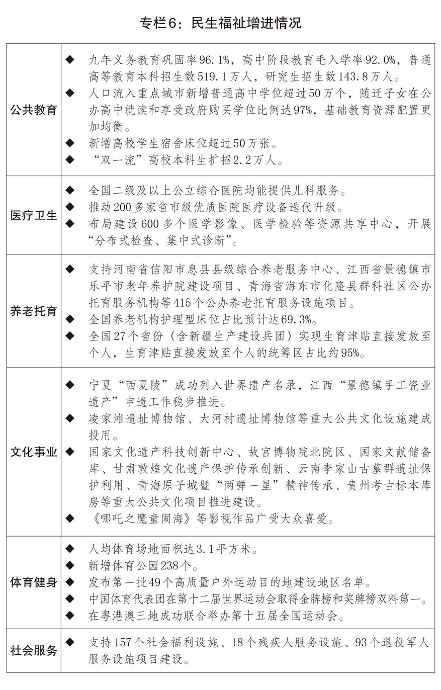 二是公共服務(wù)體系更加健全。國(guó)家基本公共服務(wù)項(xiàng)目基本實(shí)現(xiàn)城鄉(xiāng)標(biāo)準(zhǔn)統(tǒng)一、制度并軌。逐步推行免費(fèi)學(xué)前教育,2025年秋季學(xué)期起免除公辦幼兒園學(xué)前一年在園兒童保育教育費(fèi),對(duì)民辦園適齡兒童給予相應(yīng)減免。建立同人口變化相協(xié)調(diào)的基本公共教育服務(wù)供給機(jī)制,以人口流入地為重點(diǎn)加強(qiáng)普通高中建設(shè),支持“雙一流”建設(shè)高校提質(zhì)升級(jí),扎實(shí)推進(jìn)優(yōu)質(zhì)本科擴(kuò)容,推動(dòng)高校學(xué)科專業(yè)調(diào)整。實(shí)施醫(yī)療衛(wèi)生強(qiáng)基工程,推進(jìn)優(yōu)質(zhì)醫(yī)療資源向中西部等醫(yī)療資源薄弱地區(qū)有序輸出、定向放大,推動(dòng)醫(yī)院病房改造和設(shè)備更新。加強(qiáng)公共衛(wèi)生防控救治體系建設(shè)。積極推動(dòng)中醫(yī)藥振興發(fā)展。漸進(jìn)式延遲法定退休年齡改革穩(wěn)妥實(shí)施。促進(jìn)普惠養(yǎng)老服務(wù)高質(zhì)量發(fā)展,推進(jìn)醫(yī)養(yǎng)結(jié)合,提升養(yǎng)老服務(wù)機(jī)構(gòu)護(hù)理能力。大力發(fā)展銀發(fā)經(jīng)濟(jì)。以城市為單元整體推進(jìn)普惠托育服務(wù)發(fā)展。全面實(shí)施育兒補(bǔ)貼制度,對(duì)3周歲以下嬰幼兒每孩每年補(bǔ)貼3600元,并對(duì)補(bǔ)貼免征個(gè)人所得稅。完善全民健身公共服務(wù)體系,建設(shè)高質(zhì)量戶外運(yùn)動(dòng)目的地,拓展全民健身空間場(chǎng)地。開展家政服務(wù)職業(yè)技能專項(xiàng)培訓(xùn)行動(dòng),促進(jìn)家政服務(wù)業(yè)提質(zhì)擴(kuò)容。加強(qiáng)困境兒童福利保障工作,推進(jìn)社會(huì)福利服務(wù)設(shè)施建設(shè)。健全退役軍人保障服務(wù)體系。加大公益性殯葬設(shè)施支持力度。