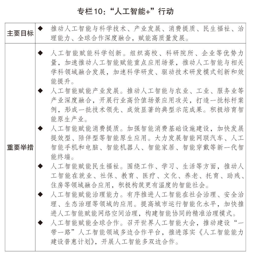 四是深入推進(jìn)數(shù)字中國(guó)建設(shè)。深入實(shí)施“人工智能+”行動(dòng),高質(zhì)量建設(shè)國(guó)家人工智能應(yīng)用中試基地,推動(dòng)人工智能在重點(diǎn)行業(yè)領(lǐng)域商業(yè)化規(guī)?;瘧?yīng)用。支持人工智能開源社區(qū)建設(shè),促進(jìn)模型、工具、數(shù)據(jù)集等匯聚開放。發(fā)展新一代智能終端以及模型即服務(wù)、智能體即服務(wù)等新產(chǎn)品新業(yè)態(tài)。加快建設(shè)全國(guó)一體化算力網(wǎng),優(yōu)化國(guó)家算力資源布局,支持公共云發(fā)展。推動(dòng)完善人工智能領(lǐng)域法律法規(guī)。加快構(gòu)建人工智能安全風(fēng)險(xiǎn)防治體系。健全數(shù)據(jù)要素基礎(chǔ)制度,出臺(tái)建設(shè)全國(guó)一體化數(shù)據(jù)市場(chǎng)的政策,積極推進(jìn)數(shù)據(jù)流通利用基礎(chǔ)設(shè)施建設(shè)和運(yùn)營(yíng),深入推進(jìn)數(shù)據(jù)要素綜合試驗(yàn)區(qū)建設(shè)。加快公共數(shù)據(jù)資源開放共享和開發(fā)利用,深入推進(jìn)可信數(shù)據(jù)空間創(chuàng)新發(fā)展試點(diǎn)、數(shù)據(jù)產(chǎn)業(yè)集聚區(qū)建設(shè)試點(diǎn)。構(gòu)建數(shù)字產(chǎn)業(yè)集群梯次布局體系,高質(zhì)量推進(jìn)數(shù)字經(jīng)濟(jì)創(chuàng)新發(fā)展試驗(yàn)區(qū)建設(shè)。實(shí)施數(shù)據(jù)賦能工程,建設(shè)數(shù)智化轉(zhuǎn)型促進(jìn)網(wǎng)絡(luò)。推進(jìn)城市全域數(shù)字化轉(zhuǎn)型。實(shí)施工業(yè)互聯(lián)網(wǎng)創(chuàng)新發(fā)展工程。強(qiáng)化平臺(tái)經(jīng)濟(jì)常態(tài)化監(jiān)管,推動(dòng)平臺(tái)企業(yè)和平臺(tái)內(nèi)經(jīng)營(yíng)者、勞動(dòng)者共贏發(fā)展。