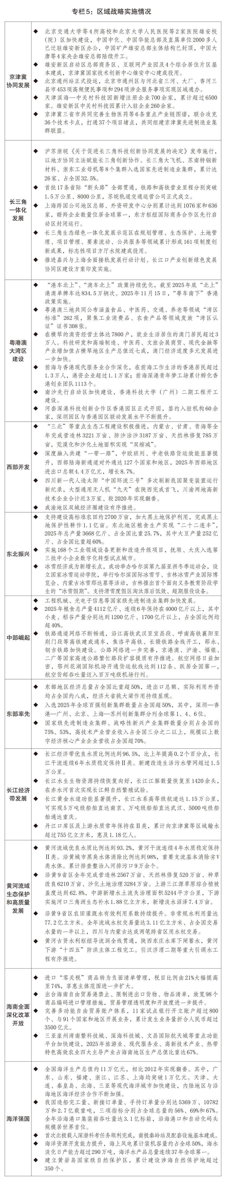 2025年是“十四五”收官之年。過(guò)去5年,以習(xí)近平同志為核心的黨中央團(tuán)結(jié)帶領(lǐng)全黨全國(guó)各族人民迎難而上、砥礪前行,經(jīng)受住世紀(jì)疫情嚴(yán)重沖擊,有效應(yīng)對(duì)一系列重大風(fēng)險(xiǎn)挑戰(zhàn),“十四五”規(guī)劃主要目標(biāo)任務(wù)勝利完成,經(jīng)濟(jì)社會(huì)發(fā)展取得一系列具有開創(chuàng)性、突破性、標(biāo)志性的重大成就。經(jīng)濟(jì)發(fā)展實(shí)現(xiàn)歷史性跨越。2025年經(jīng)濟(jì)總量比2020年增長(zhǎng)超過(guò)35%,對(duì)世界經(jīng)濟(jì)增長(zhǎng)貢獻(xiàn)保持在30%左右;制造業(yè)增加值比2020年增長(zhǎng)31%,規(guī)模連續(xù)16年全球第一;國(guó)家綜合立體交通網(wǎng)主骨架建成率超過(guò)90%;制造業(yè)投資實(shí)現(xiàn)7.7%的年均增長(zhǎng);常住人口城鎮(zhèn)化率比2020年末提高4個(gè)百分點(diǎn)。創(chuàng)新驅(qū)動(dòng)取得重大突破。全社會(huì)研發(fā)經(jīng)費(fèi)投入總量達(dá)到3.9萬(wàn)億元,一批關(guān)鍵核心技術(shù)攻關(guān)實(shí)現(xiàn)突破,第一艘國(guó)產(chǎn)電磁彈射航母福建艦下水,全球第一座第四代核電站石島灣基地投入商業(yè)運(yùn)行,國(guó)產(chǎn)大飛機(jī)C919第一次實(shí)現(xiàn)商業(yè)運(yùn)營(yíng),若干“國(guó)之重器”站上創(chuàng)新制高點(diǎn);科技創(chuàng)新推動(dòng)產(chǎn)業(yè)加快升級(jí),技術(shù)合同成交額約為2020年的2.67倍,集成電路成為單一商品出口第一,工業(yè)機(jī)器人、無(wú)人機(jī)等產(chǎn)量位居世界首位。民生保障扎實(shí)有力。城鄉(xiāng)居民收入比由2020年的2.56縮小至2.31;基本公共服務(wù)水平明顯提升,城鄉(xiāng)居民全國(guó)基礎(chǔ)養(yǎng)老金最低標(biāo)準(zhǔn)、基本醫(yī)療保險(xiǎn)人均財(cái)政補(bǔ)助標(biāo)準(zhǔn)分別比2020年提高53.8%、27.3%,勞動(dòng)年齡人口平均受教育年限、人均預(yù)期壽命比2020年分別增加0.5年、1年以上。綠色發(fā)展底色更加鮮明。“增綠”全球最多,森林覆蓋率超過(guò)25%,新增森林面積貢獻(xiàn)全球新增綠化面積約25%;“治污”成效顯著,地級(jí)及以上城市空氣質(zhì)量?jī)?yōu)良天數(shù)比例比2020年提高2.3個(gè)百分點(diǎn),長(zhǎng)江、黃河干流全線連續(xù)多年保持在Ⅱ類水質(zhì)標(biāo)準(zhǔn);“用能”更加清潔,新能源發(fā)電裝機(jī)規(guī)模歷史性超過(guò)煤電,構(gòu)建起全球最大的可再生能源體系。安全保障能力明顯增強(qiáng)。糧食、能源、產(chǎn)業(yè)等安全基礎(chǔ)進(jìn)一步夯實(shí),應(yīng)急救災(zāi)能力越來(lái)越強(qiáng),國(guó)防實(shí)力和經(jīng)濟(jì)實(shí)力同步提升,防范化解風(fēng)險(xiǎn)、抵御沖擊挑戰(zhàn)、捍衛(wèi)國(guó)家和人民利益的能力不斷提高。治理效能和大國(guó)擔(dān)當(dāng)充分彰顯。全國(guó)統(tǒng)一大市場(chǎng)加快構(gòu)建,民營(yíng)企業(yè)數(shù)量比2020年增長(zhǎng)超過(guò)40%,制造業(yè)外資準(zhǔn)入限制“清零”。堅(jiān)定履行“雙碳”承諾,單位國(guó)內(nèi)生產(chǎn)總值碳排放累計(jì)降低17.7%。高質(zhì)量共建“一帶一路”不斷走深走實(shí),合作范圍擴(kuò)大到150多個(gè)國(guó)家和30多個(gè)國(guó)際組織,多領(lǐng)域合作取得重大進(jìn)展和成效。