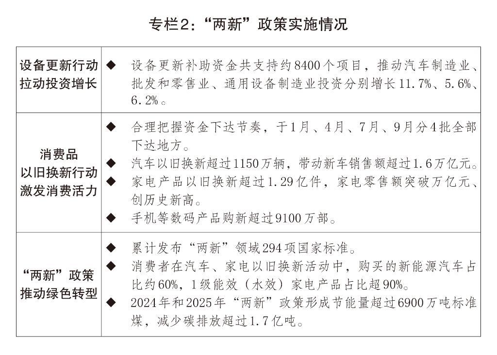 一是政策組合拳協(xié)同增效。適時(shí)推出穩(wěn)就業(yè)穩(wěn)經(jīng)濟(jì)推動(dòng)高質(zhì)量發(fā)展的若干舉措,支持穩(wěn)崗就業(yè)、穩(wěn)定外貿(mào)、促進(jìn)消費(fèi)、擴(kuò)大投資。發(fā)行超長(zhǎng)期特別國(guó)債1.3萬(wàn)億元、新增地方政府專項(xiàng)債券4.4萬(wàn)億元,安排7350億元中央預(yù)算內(nèi)投資,安排5000億元地方政府債務(wù)結(jié)存限額用于補(bǔ)充地方政府綜合財(cái)力和擴(kuò)大有效投資,發(fā)行5000億元特別國(guó)債補(bǔ)充大型商業(yè)銀行核心一級(jí)資本,投放新型政策性金融工具補(bǔ)充重點(diǎn)項(xiàng)目資本金。下調(diào)存款準(zhǔn)備金率50個(gè)基點(diǎn)。下調(diào)政策利率10個(gè)基點(diǎn),全年全國(guó)新發(fā)放企業(yè)貸款加權(quán)平均利率比上年下降41個(gè)基點(diǎn)。支持小微企業(yè)融資協(xié)調(diào)工作機(jī)制高效運(yùn)行,截至2025年底新發(fā)放貸款30.4萬(wàn)億元。用好結(jié)構(gòu)性貨幣政策工具,設(shè)立債券市場(chǎng)“科技板”。年末廣義貨幣供應(yīng)量(M2)余額、社會(huì)融資規(guī)模存量分別增長(zhǎng)8.5%、8.3%?!耙粯I(yè)一策、一企一策”加大對(duì)外貿(mào)行業(yè)企業(yè)支持力度,擴(kuò)大出口信用保險(xiǎn)承保規(guī)模和覆蓋面。加快內(nèi)外貿(mào)一體化發(fā)展,推進(jìn)產(chǎn)銷對(duì)接。