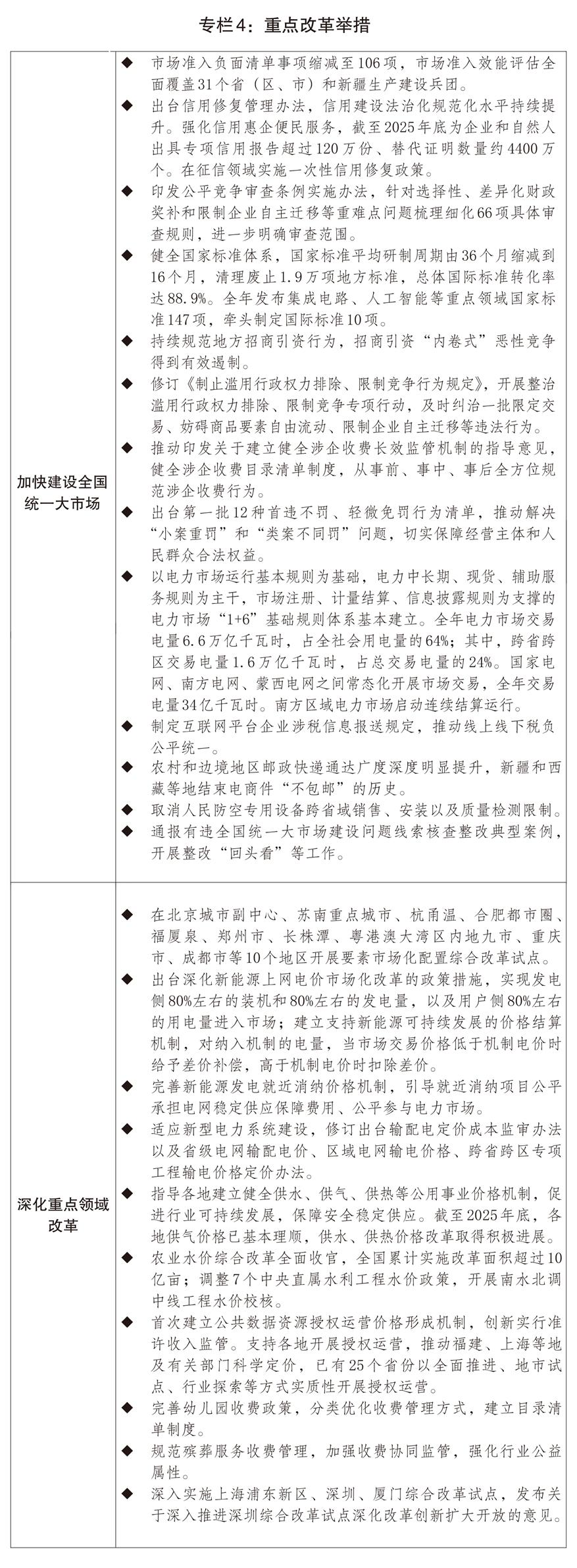 一是全國(guó)統(tǒng)一大市場(chǎng)建設(shè)向縱深推進(jìn)。實(shí)施全國(guó)統(tǒng)一大市場(chǎng)建設(shè)指引,出臺(tái)市場(chǎng)準(zhǔn)入負(fù)面清單(2025年版),清單事項(xiàng)縮減至106項(xiàng)。深入開展市場(chǎng)準(zhǔn)入壁壘清理整治行動(dòng),累計(jì)修訂或廢止相關(guān)文件2300余件。加快建設(shè)統(tǒng)一開放的交通運(yùn)輸市場(chǎng),實(shí)施交通物流降本提質(zhì)增效行動(dòng)計(jì)劃,市場(chǎng)設(shè)施聯(lián)通更加高效順暢。推動(dòng)修訂反不正當(dāng)競(jìng)爭(zhēng)法,出臺(tái)公平競(jìng)爭(zhēng)審查條例實(shí)施辦法,開展整治濫用行政權(quán)力排除、限制競(jìng)爭(zhēng)專項(xiàng)行動(dòng)。持續(xù)規(guī)范地方招商引資行為,招商引資亂象得到有效遏制,地方制定實(shí)施政策的合規(guī)意識(shí)明顯增強(qiáng)。出臺(tái)健全社會(huì)信用體系的意見,構(gòu)建信用修復(fù)制度,建立企業(yè)信用狀況綜合評(píng)價(jià)體系,全面推行以專項(xiàng)信用報(bào)告替代有無(wú)違法違規(guī)記錄證明。全國(guó)統(tǒng)一電力市場(chǎng)體系初步建立,跨電網(wǎng)經(jīng)營(yíng)區(qū)常態(tài)化電力交易機(jī)制基本建立,電力現(xiàn)貨市場(chǎng)基本覆蓋全國(guó)。