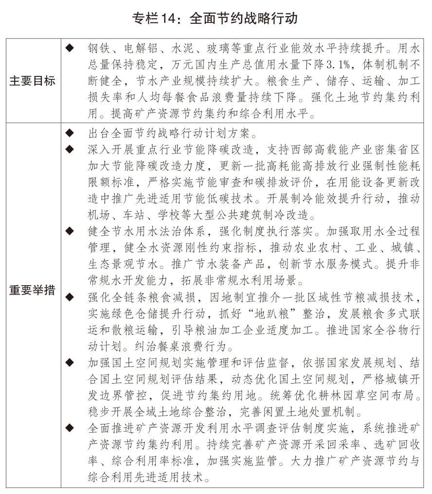 三是全面節(jié)約戰(zhàn)略實(shí)施成效明顯。統(tǒng)籌推進(jìn)“能水糧地礦材”一體化節(jié)約。有力有效管控高耗能高排放項(xiàng)目,深入實(shí)施重點(diǎn)領(lǐng)域節(jié)能降碳專項(xiàng)行動(dòng),加快存量項(xiàng)目改造升級(jí)和依規(guī)淘汰,制修訂24項(xiàng)能效能耗強(qiáng)制性國(guó)家標(biāo)準(zhǔn),扣除原料用能和非化石能源消費(fèi)量后的單位國(guó)內(nèi)生產(chǎn)總值能耗降低5.1%。建立健全農(nóng)業(yè)節(jié)水增效、工業(yè)節(jié)水減排、城鎮(zhèn)節(jié)水降損制度體系,加強(qiáng)再生水等非常規(guī)水利用,萬(wàn)元國(guó)內(nèi)生產(chǎn)總值用水量下降4%左右。深入開展糧食節(jié)約和反食品浪費(fèi)行動(dòng),強(qiáng)化全鏈條糧食減損和餐飲行業(yè)反浪費(fèi)。大力發(fā)展循環(huán)經(jīng)濟(jì),加快構(gòu)建廢棄物循環(huán)利用體系,提高資源綜合利用水平,廢鋼鐵、廢有色金屬等10種主要再生資源回收量超過(guò)4億噸,大宗固體廢物綜合利用率超60%,主要資源產(chǎn)出率進(jìn)一步提高。