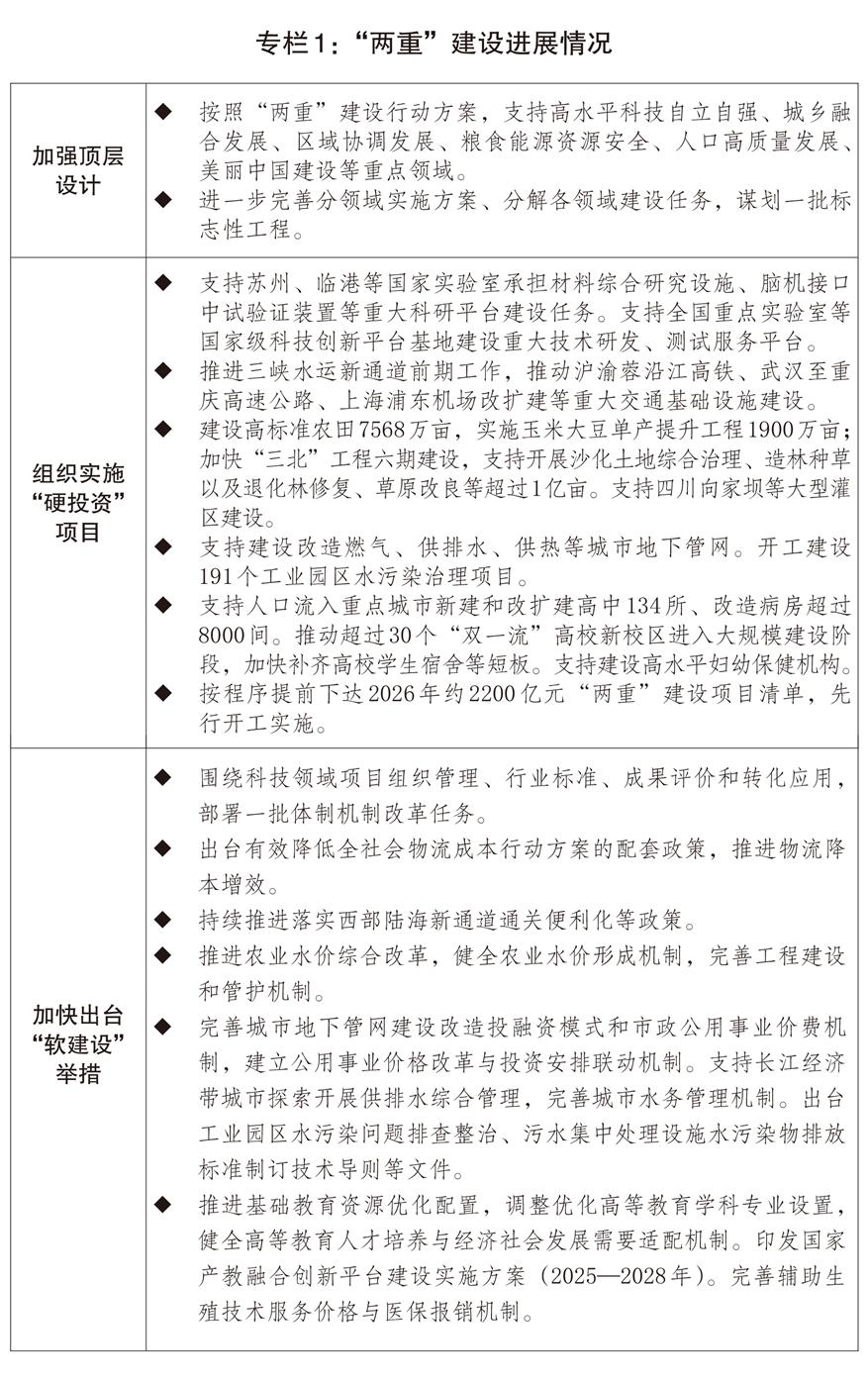 三是高質(zhì)量推進(jìn)“兩重”建設(shè)。牢牢把握戰(zhàn)略性、前瞻性、全局性,強(qiáng)化項(xiàng)目謀劃儲(chǔ)備,優(yōu)化實(shí)施“兩重”項(xiàng)目,著力推動(dòng)國(guó)家重大戰(zhàn)略深入實(shí)施、重點(diǎn)領(lǐng)域安全能力穩(wěn)步提升。安排超長(zhǎng)期特別國(guó)債8000億元支持“兩重”建設(shè),重點(diǎn)支持科技自立自強(qiáng)、未來(lái)產(chǎn)業(yè)發(fā)展、農(nóng)業(yè)轉(zhuǎn)移人口市民化、城市地下管網(wǎng)管廊建設(shè)改造、長(zhǎng)江經(jīng)濟(jì)帶生態(tài)環(huán)境保護(hù)、長(zhǎng)江沿線重大交通基礎(chǔ)設(shè)施、西部陸海新通道建設(shè)、高標(biāo)準(zhǔn)農(nóng)田建設(shè)、高等教育提質(zhì)升級(jí)等方面任務(wù)。加強(qiáng)項(xiàng)目審核把關(guān),盡早下達(dá)全部項(xiàng)目清單,同步推動(dòng)“軟建設(shè)”措施落地見效,促進(jìn)形成項(xiàng)目建設(shè)實(shí)施和運(yùn)營(yíng)維護(hù)長(zhǎng)效機(jī)制。加強(qiáng)超長(zhǎng)期特別國(guó)債資金監(jiān)管,合理安排項(xiàng)目建設(shè)與資金撥付節(jié)奏,強(qiáng)化項(xiàng)目與資金匹配。組織中央企業(yè)實(shí)施一批跨區(qū)域跨流域、產(chǎn)業(yè)鏈供應(yīng)鏈較長(zhǎng)的“兩重”建設(shè)項(xiàng)目,引導(dǎo)更多民間資本參與,積極撬動(dòng)信貸資金,切實(shí)放大“兩重”效應(yīng)。嚴(yán)格工程質(zhì)量和安全管理,打造一批精品工程。