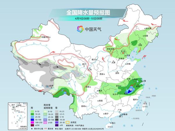 明天,新疆南疆盆地、西藏大部、青海南部和西部、川西高原北部、內(nèi)蒙古東部、黑龍江東南部、吉林東部等地部分地區(qū)有小到中雪或雨夾雪,其中,西藏北部、青海西部等地部分地區(qū)有大雪;西藏東南部、湖北東南部、蘇皖南部、上海、浙江北部、江西北部等地部分地區(qū)有中到大雨,其中,江西北部等地部分地區(qū)有暴雨。