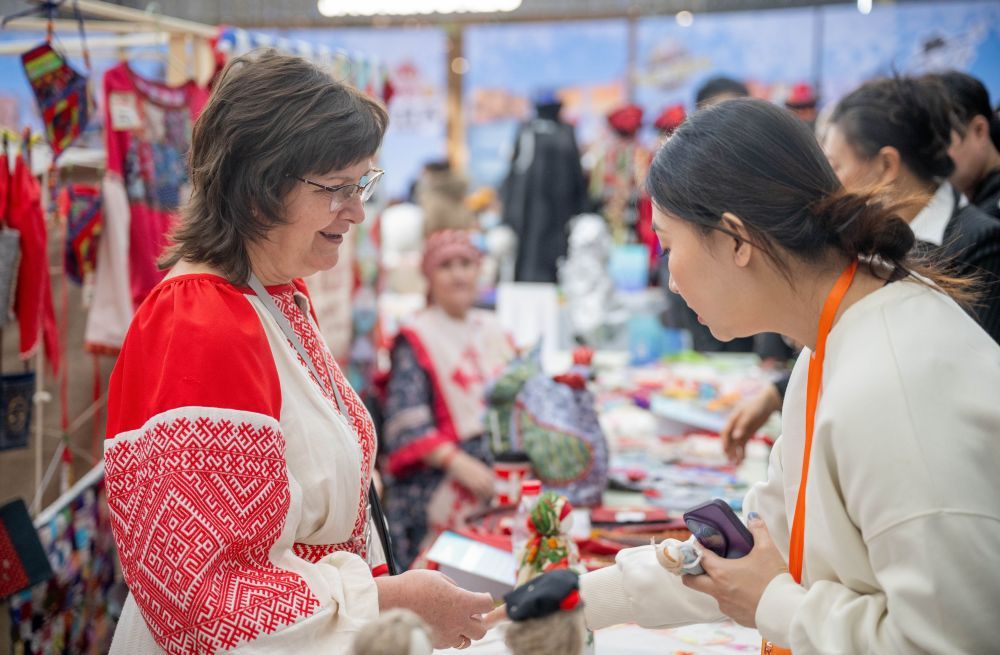 2025年12月20日,滿洲里市民在一場文化交流活動中了解俄羅斯手工藝品。新華社記者 連振 攝