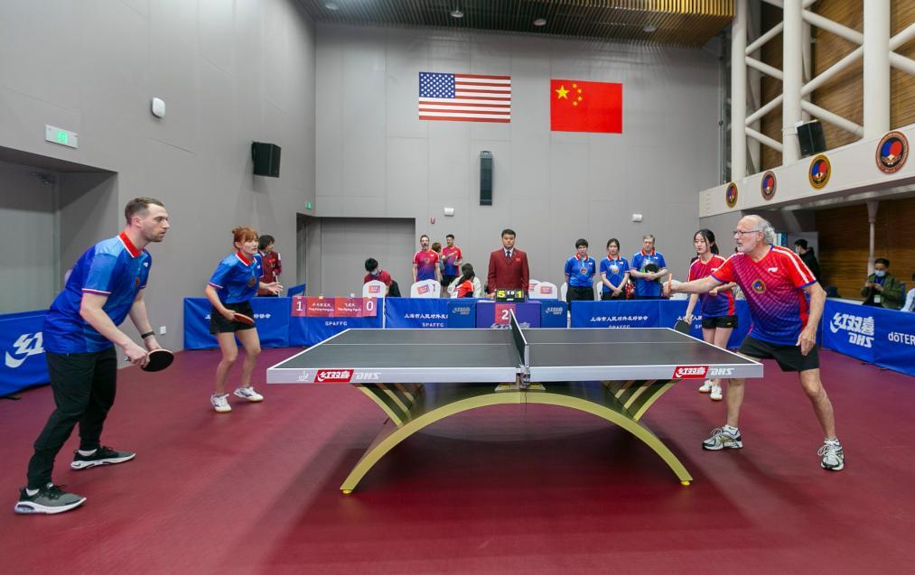 2021年4月10日,上海舉行紀(jì)念中美“乒乓外交”50周年系列活動。這是中美選手參加乒乓球友誼賽。新華社記者 王翔 攝