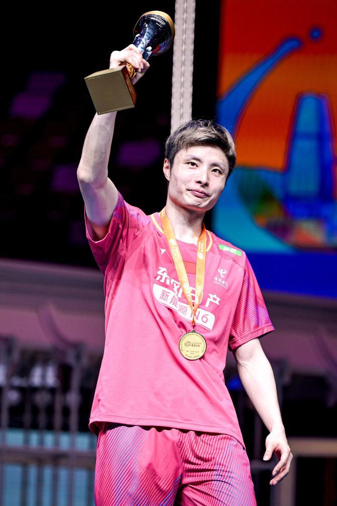 4月12日,石宇奇在頒獎(jiǎng)儀式上舉起獎(jiǎng)杯。新華社記者 江漢 攝