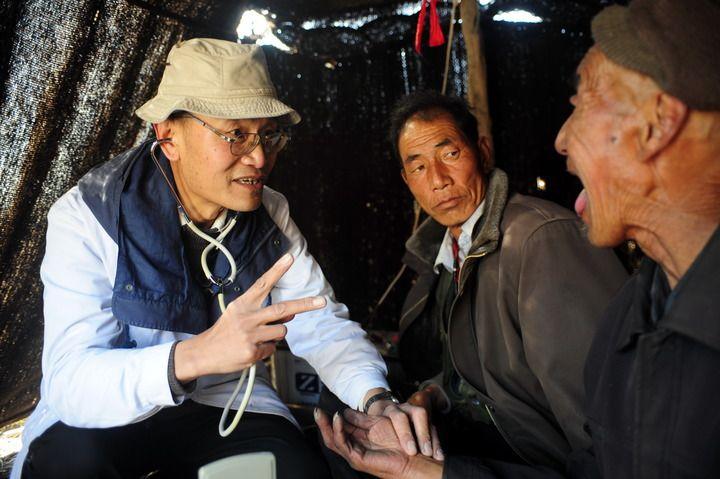 2012年10月30日,王萬青(左)在牧民帳篷內(nèi)為牧民診斷病情(資料圖片)。新華社記者 張錳 攝