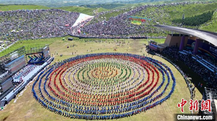 2024年8月4日,第22屆九色甘南香巴拉旅游藝術(shù)節(jié)在甘肅省甘南藏族自治州當(dāng)周草原開(kāi)幕。圖為開(kāi)幕式現(xiàn)場(chǎng)鍋莊舞表演。(資料圖)九美旦增 攝
