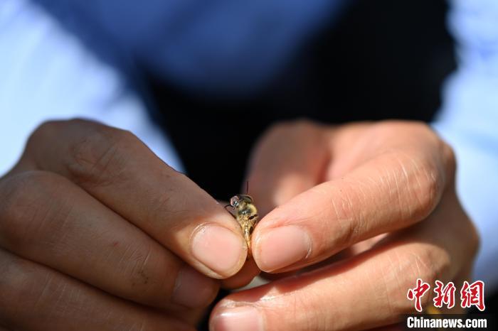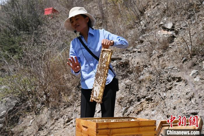 圖為工作人員展示用智慧蜂箱養(yǎng)殖的中華蜂。中新社記者 九美旦增 攝