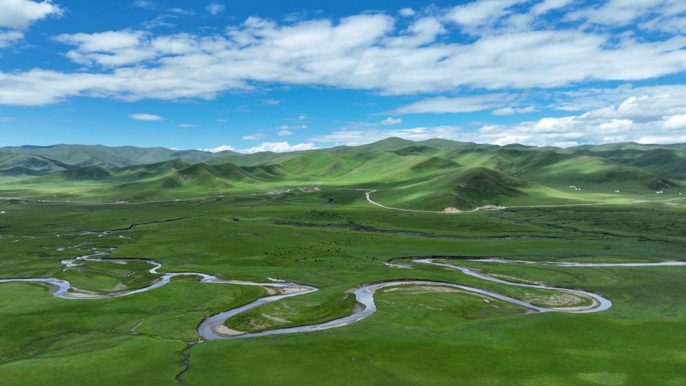 這是甘肅省甘南藏族自治州瑪曲縣阿萬倉(cāng)濕地景色(2023年7月6日攝,無人機(jī)照片)。新華社記者 陳斌 攝