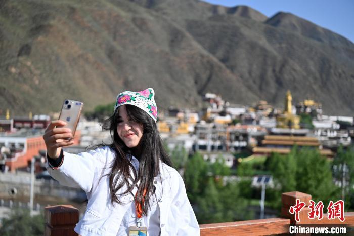 6月10日,迪拜中阿衛(wèi)視主持人阿斯瑪在參觀拉卜楞寺景區(qū)時(shí)自拍留念。九美旦增 攝