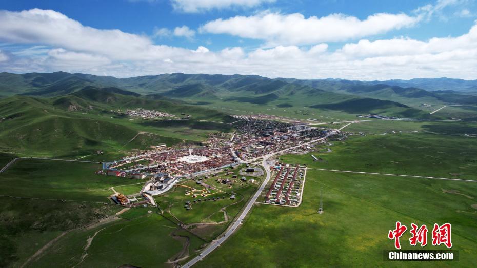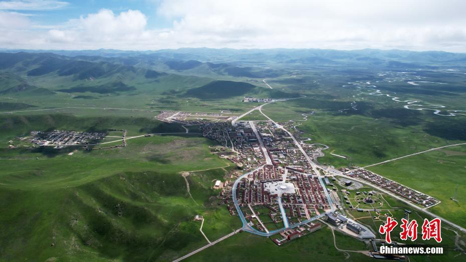 7月12日,航拍視角下的瑪曲縣阿萬(wàn)倉(cāng)鎮(zhèn)。(無(wú)人機(jī)照片)中新社記者 九美旦增 攝
