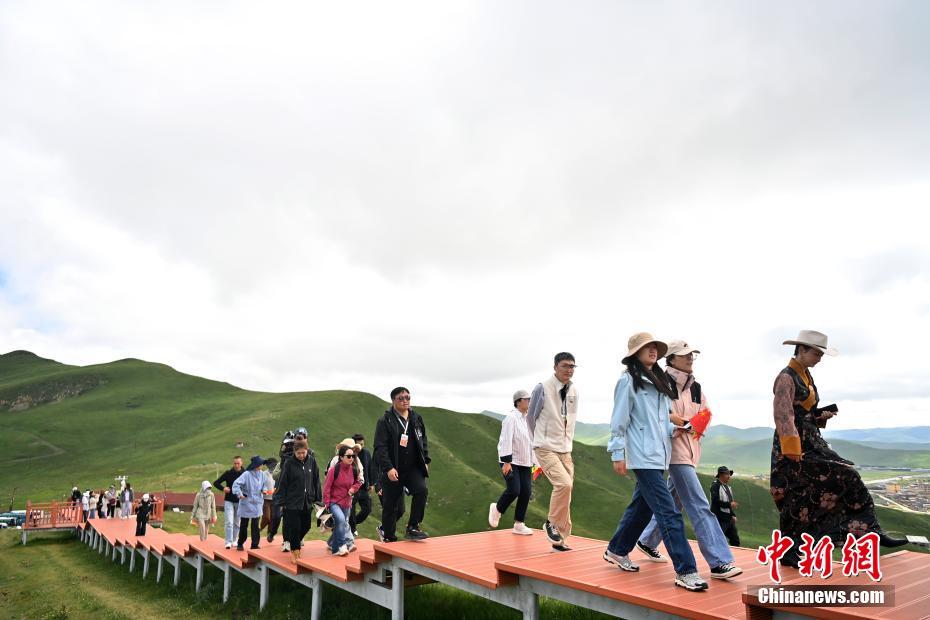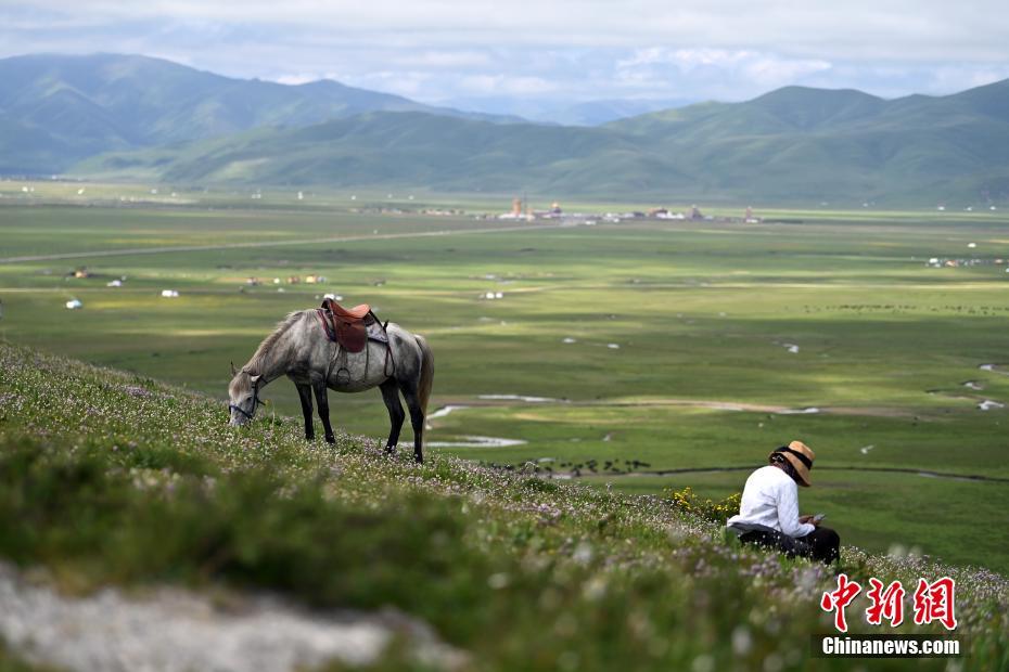 7月12日,游客在瑪曲縣阿萬(wàn)倉(cāng)濕地游覽。中新社記者 九美旦增 攝