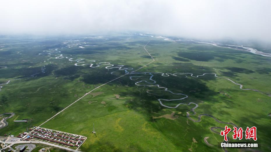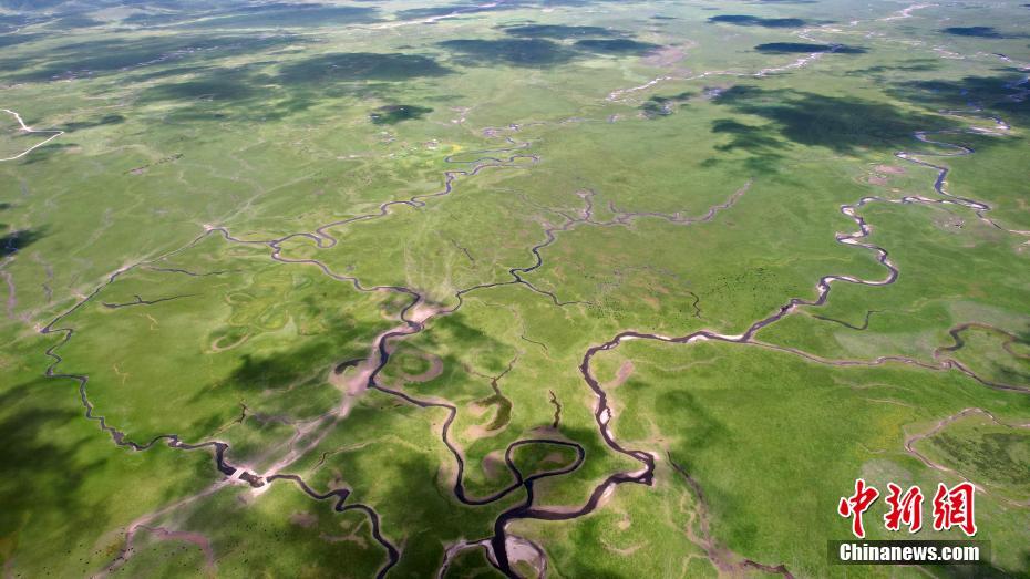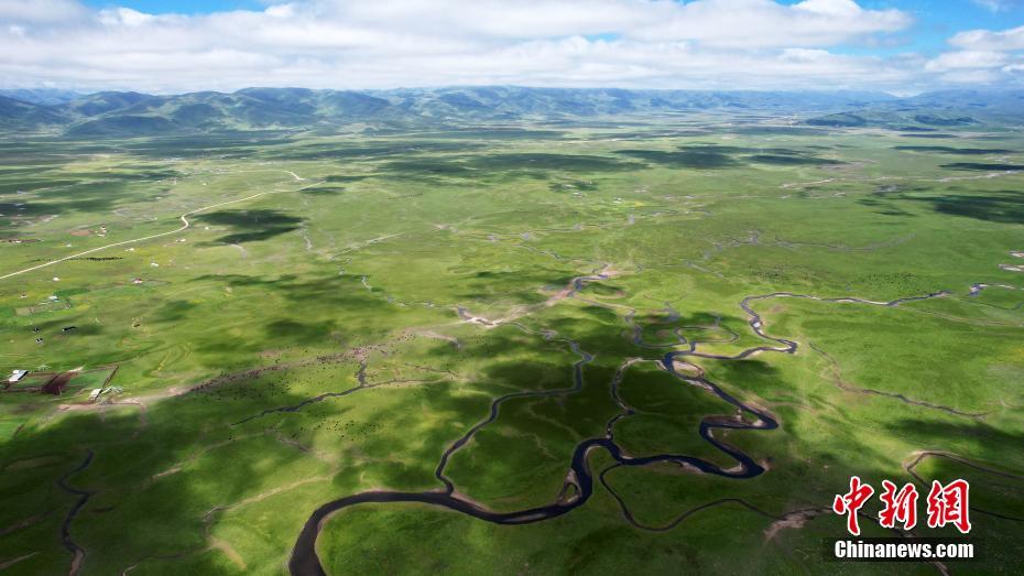 7月12日,瑪曲縣阿萬(wàn)倉(cāng)濕地風(fēng)景如畫(huà)。(無(wú)人機(jī)照片)中新社記者 九美旦增 攝