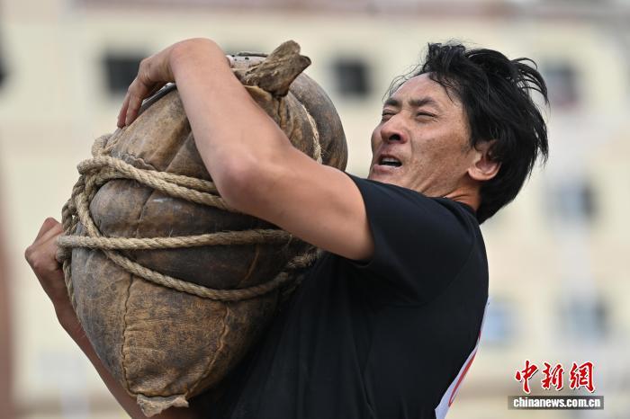 圖為舉皮袋項(xiàng)目比賽現(xiàn)場。中新社記者 九美旦增 攝