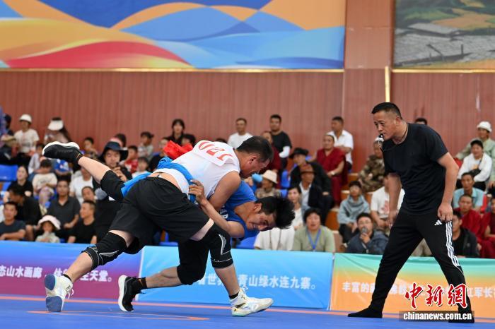圖為藏式摔跤比賽現(xiàn)場。中新社記者 九美旦增 攝