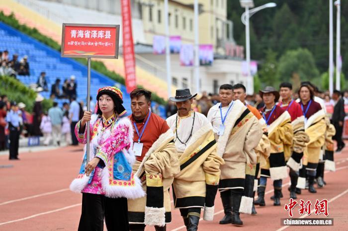 圖為青海省澤庫縣參賽代表隊(duì)入場。中新社記者 九美旦增 攝