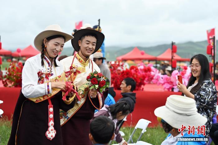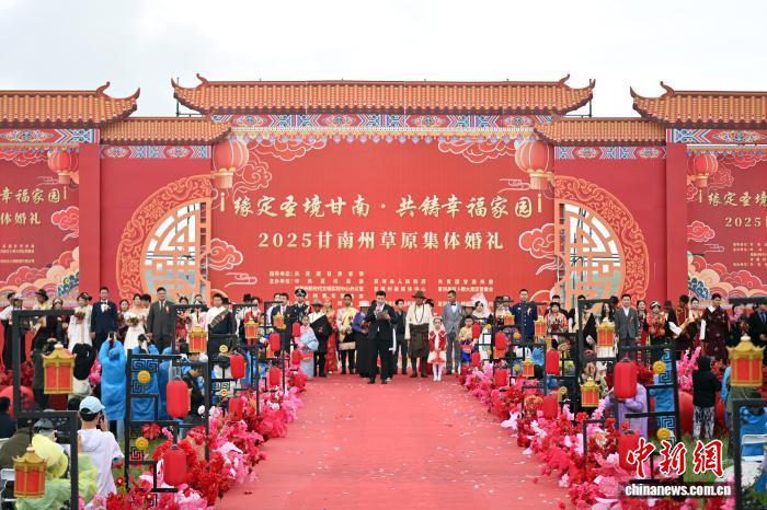 7月25日,“緣定圣境甘南·共鑄幸福家園”2025甘南州草原集體婚禮在甘肅省甘南藏族自治州夏河縣桑科草原舉行,來自天津、寧夏、甘肅等地的數(shù)十對(duì)新人,穿著各自民族的結(jié)婚服飾,在草原上感受草原婚禮的獨(dú)特魅力。