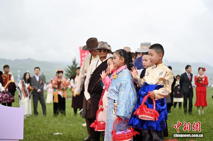 圖為參加集體婚禮的新人在小花童的引領(lǐng)下入場(chǎng)。中新社記者 九美旦增 攝