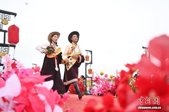 圖為活動(dòng)現(xiàn)場(chǎng)的藏式迎親。中新社記者 九美旦增 攝
