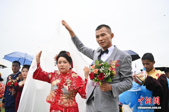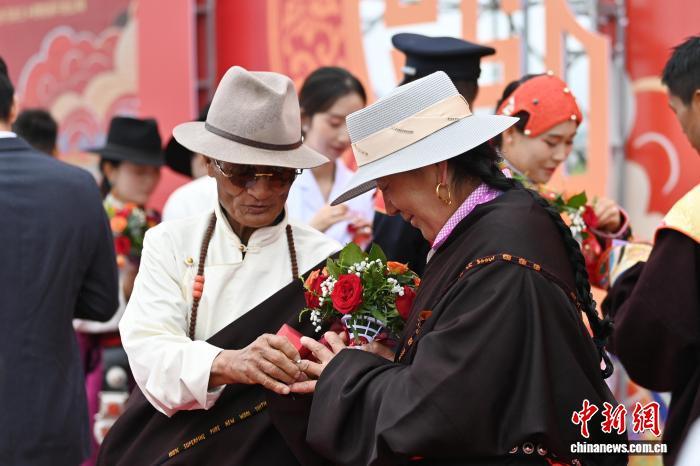 圖為金婚銀婚代表向新人送祝福。中新社記者 九美旦增 攝